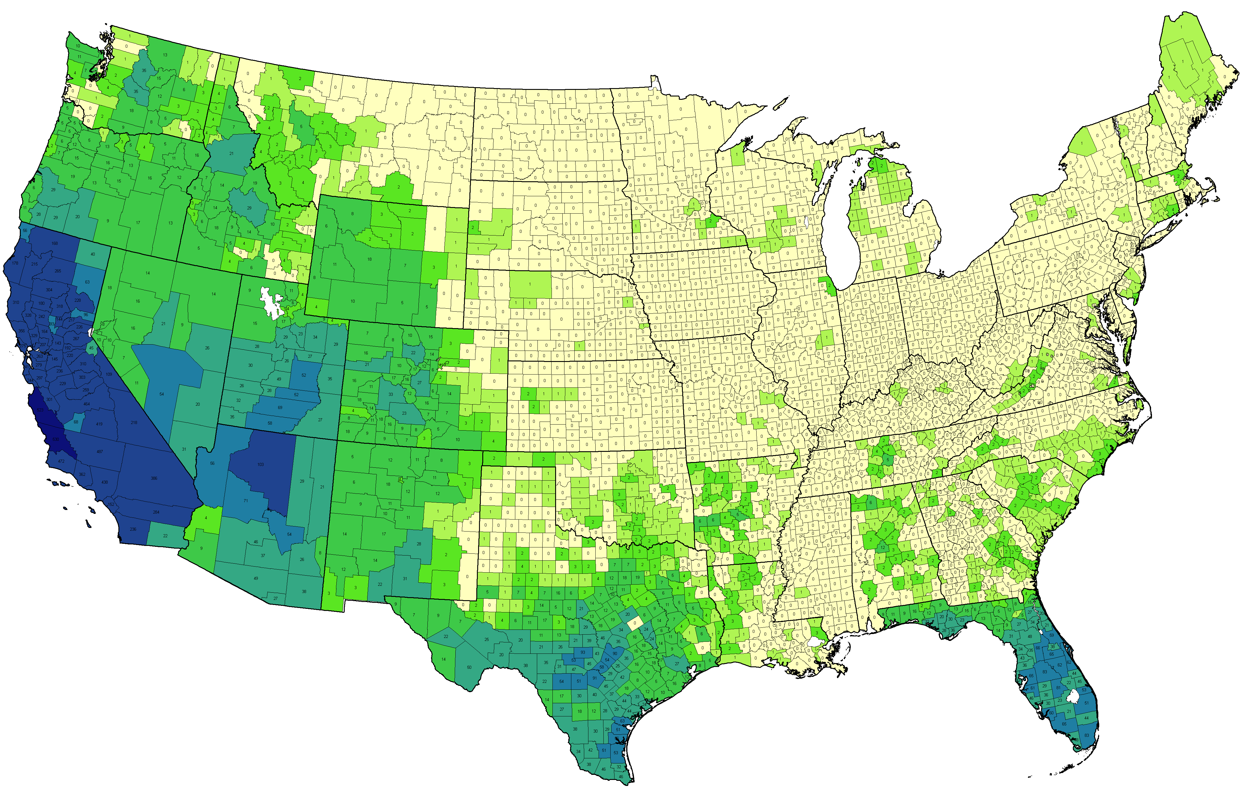 |  Actual number of US State Endemic taxa (excludes microspecies of Rubus and Crataegus) recorded from each county (data 2011). ©BONAP